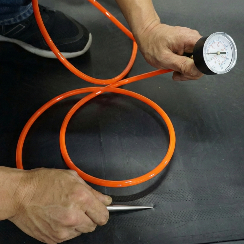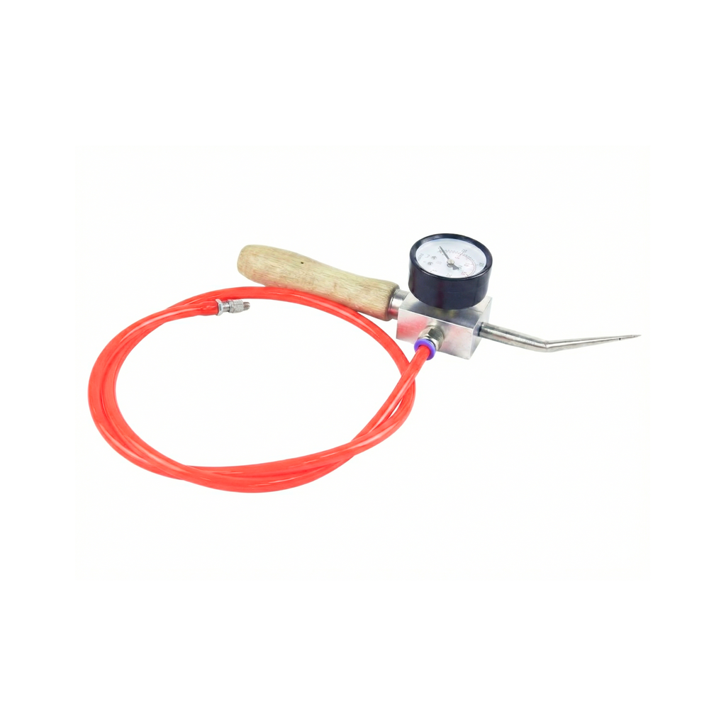 Inserte la aguja en el canal de aire creado por la soldadura de doble cordón, selle el extremo opuesto del canal y proceda a inyectar aire a través del manómetro hasta alcanzar la presión requerida por la norma técnica del proyecto. Monitoree el dial para detectar cualquier caída de presión que indique una posible fuga.