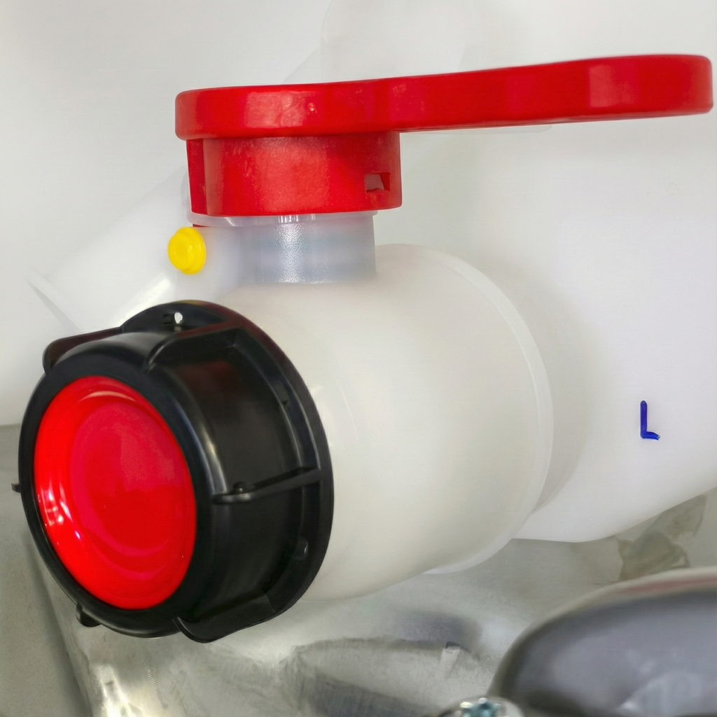 - Sistema de vaciado eficiente: Cuenta con una válvula de descarga inferior para un control preciso del flujo y una tapa superior de llenado roscada.
