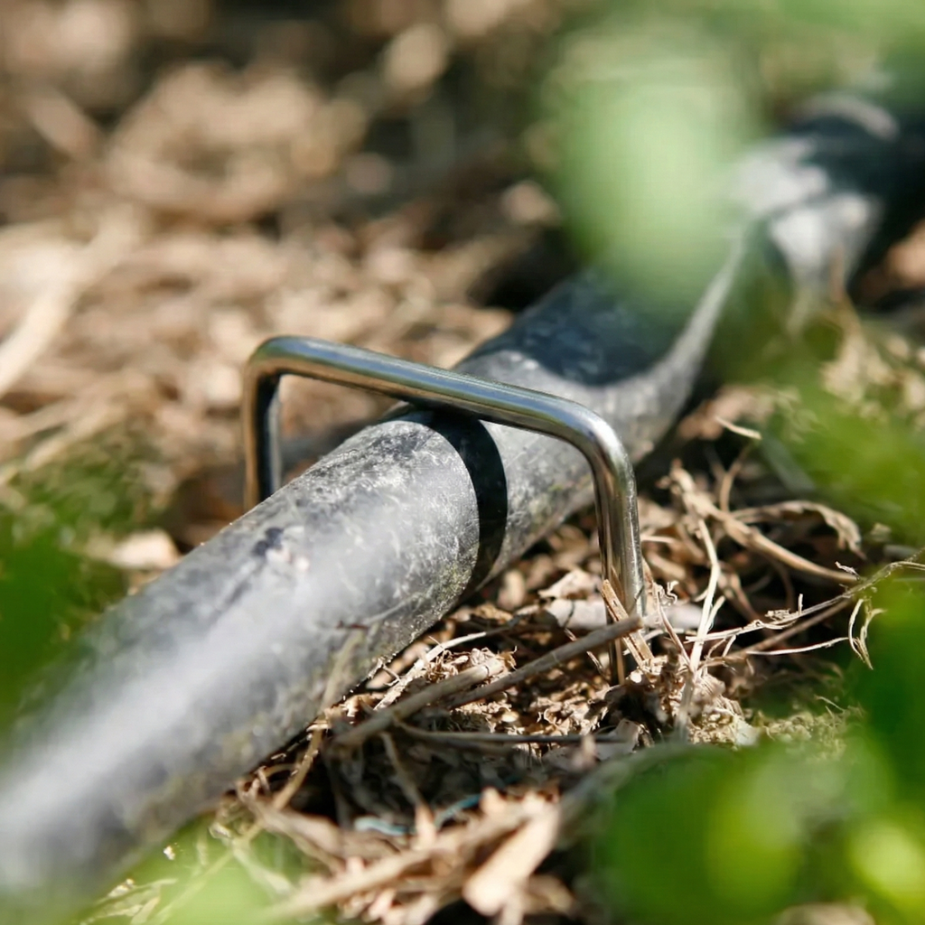 - Sujeción de mangueras de riego por goteo y tuberías de polietileno al suelo.